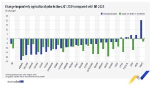 A nivel nacional, la mayoría de los países de la UE (21 de 25 con datos disponibles) registraron un descenso de los precios de la producción agrícola en el primer trimestre de 2024, en comparación con el mismo trimestre de 2023. Los descensos de precios más acusados se registraron en Hungría (-24%), Bulgaria y Rumanía (ambos -18%), y Eslovaquia y Chequia (ambos -17%).
